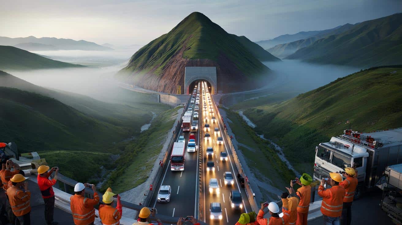 On a foggy morning in Gansu province, headlights disappear one by one into the mountainside. Trucks, buses, small family cars – they all slide into the same dark opening carved straight through the rock, as if the mountain itself has learned to breathe traffic. On the control screens in a nearby monitoring room, a yellow line slowly fills with moving dots representing every vehicle inside this new artery of concrete and steel. Outside, workers in orange vests take photos on their phones, half proud, half exhausted.