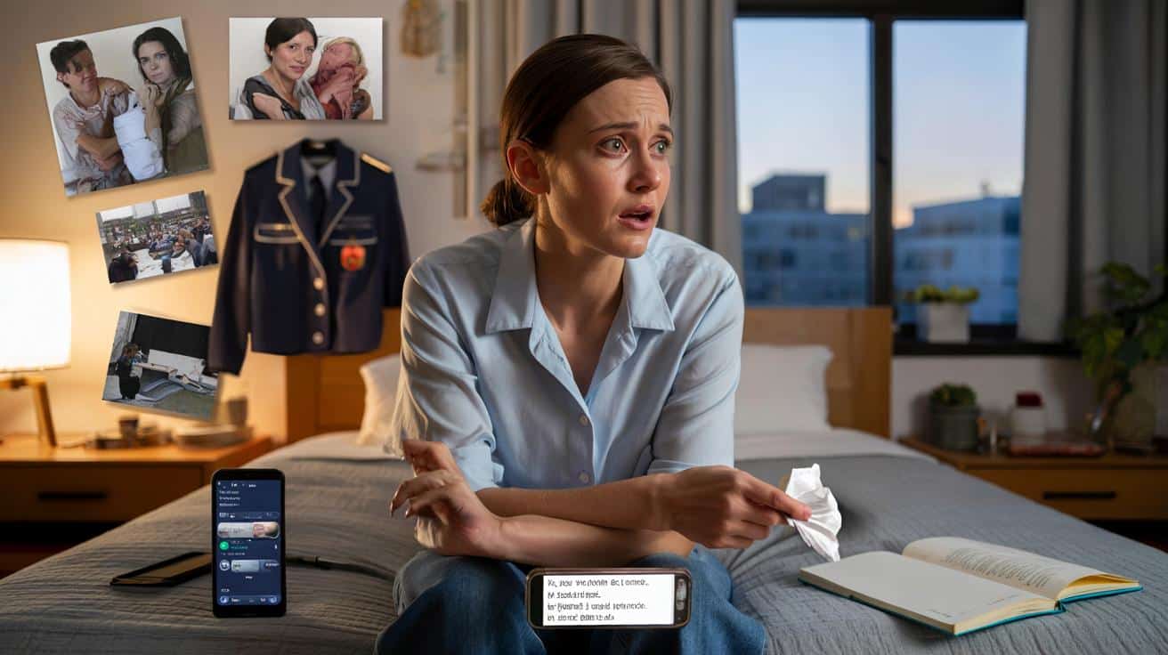 She wipes it away with the back of her hand like it’s nothing, but her shoulders stay tense, as if holding back a wave. On her phone screen: a message from her therapist asking, “What would change if you stopped being ‘the strong one’ all the time?”